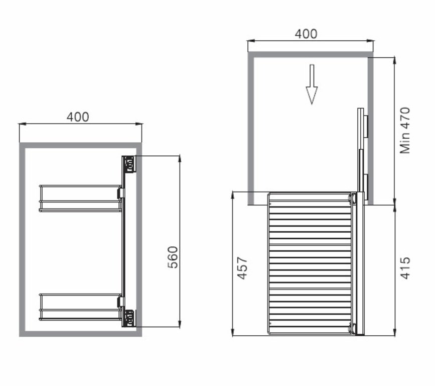Výsuvný rám, 2 závěs police, 318x457x560 mm, pravý, hliník elox. + chrom