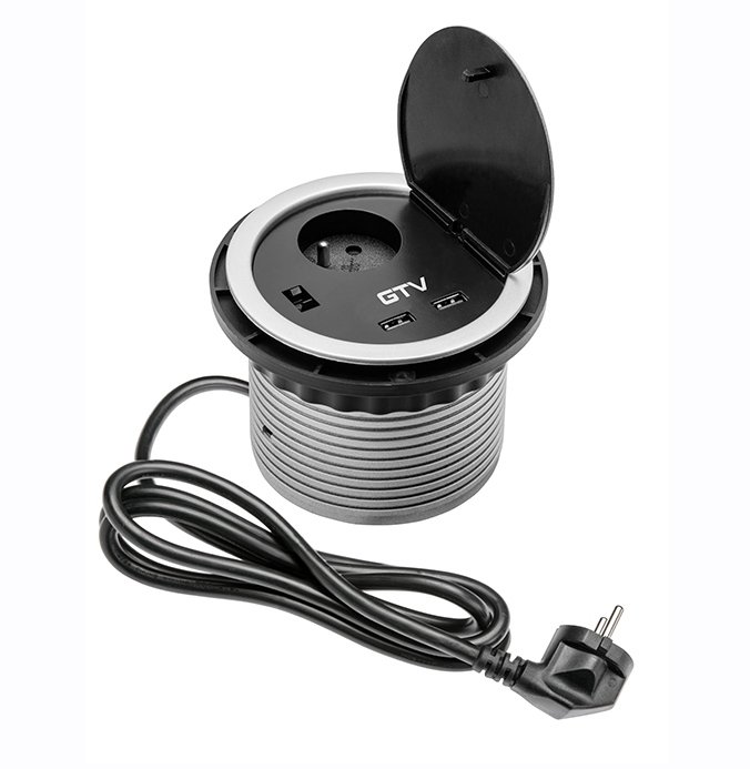 Zásuvka stolní vestavěná, 1x zásuvka s uzemněním, 1XUSB 2A/5V, alu, kabel 1,9m se zástrčkou.