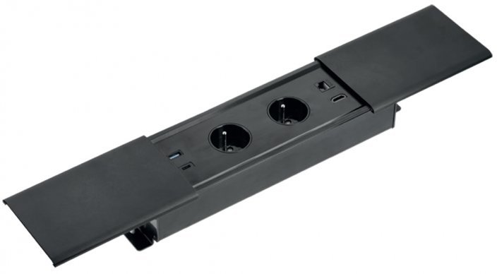 Praktický a elegantní vestavný zásuvkový blok PRESTINO v ČERNÉ barvě s posuvným horním krytem pro montáž do pracovní desky je moderní řešení, které se používá v obchodech, konferenčních místnostech, kancelářích, pracovnách, hotelích ale i doma. V případě potřeby lze jednotku snadno otevřít posunutím magnetického krytu, který chrání zásuvky před vlhkostí, prachem a nečistotou. Výrobek je určen pro vnitřní instalaci do stolů, pracovních desek, nábytku a montáž je možná vertikálně i horizontálně. Kromě standardních napájecích zásuvek 230V má také 2 nabíjecí USB porty (port USB-A 3A/5V) a (port USB-C 3A/5V) pro nabíjení mobilních telefonů a dalších elektronických zařízení, součástí bloku jsou také konektory HDMI, RJ45 a přívodní kabel o délce 1.5m. Technické parametry: