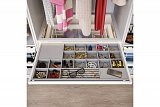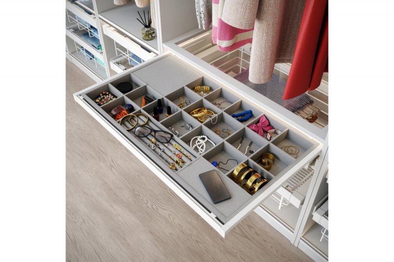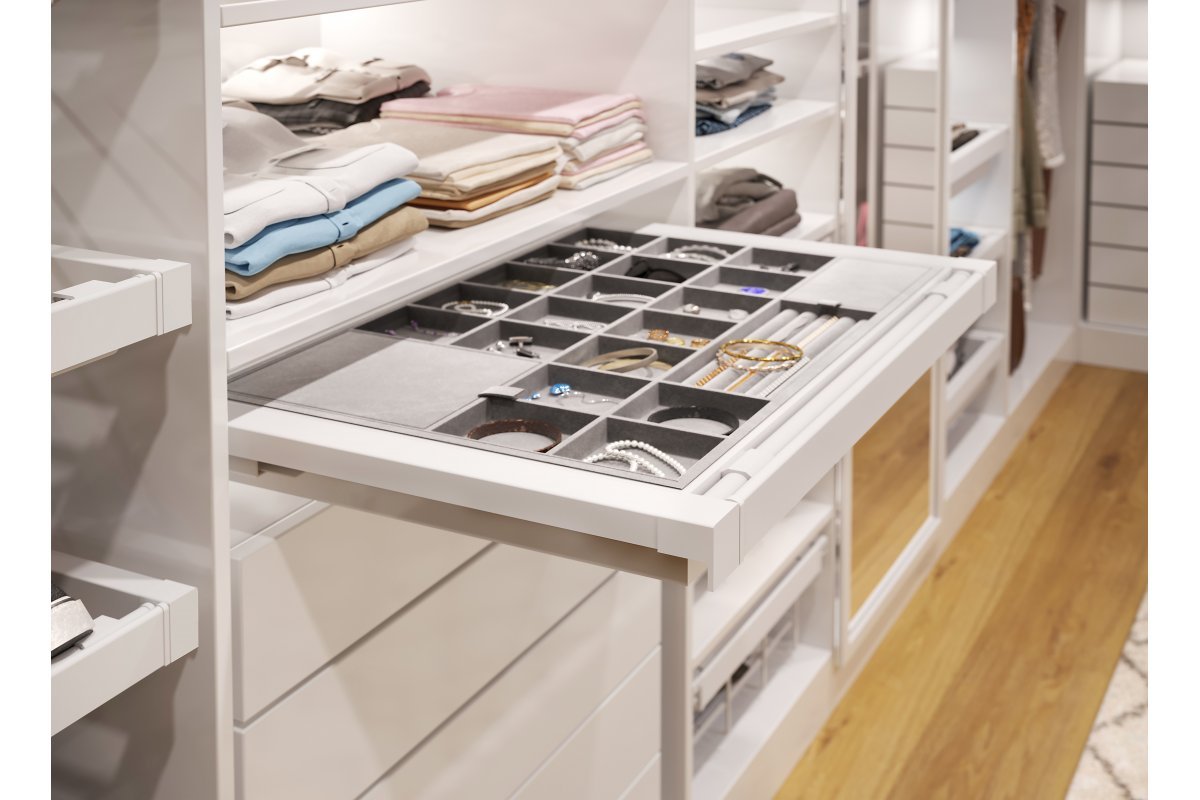 Zásuvka na šperky ELITE má měkkou, sametovou podšívku a několik přihrádek, které chrání šperky před poškozením a udržují věci v pořádku. Menší přihrádky jsou ideální pro ukládání náušnic a prstenů, zatímco větší mohou snadno pojmout doplňky, jako jsou ozdoby na vlasy nebo sluneční brýle. Organizér je k dispozici ve dvou barevných variantách a čtyřech velikostních variantách s možností přizpůsobení šířky karoserii. Technologie tichého zavírání a plné vysunutí usnadňují každodenní používání zásuvky. Sada je vybavena dvěma kusy spodních montážních vodítek, dvěma kusy vodicích krytů, dvěma kusy košové montáže, rámem s nastavením šířky +/- 58 mm, zásuvkou s přepážkami a šrouby.