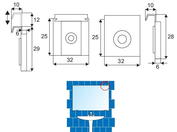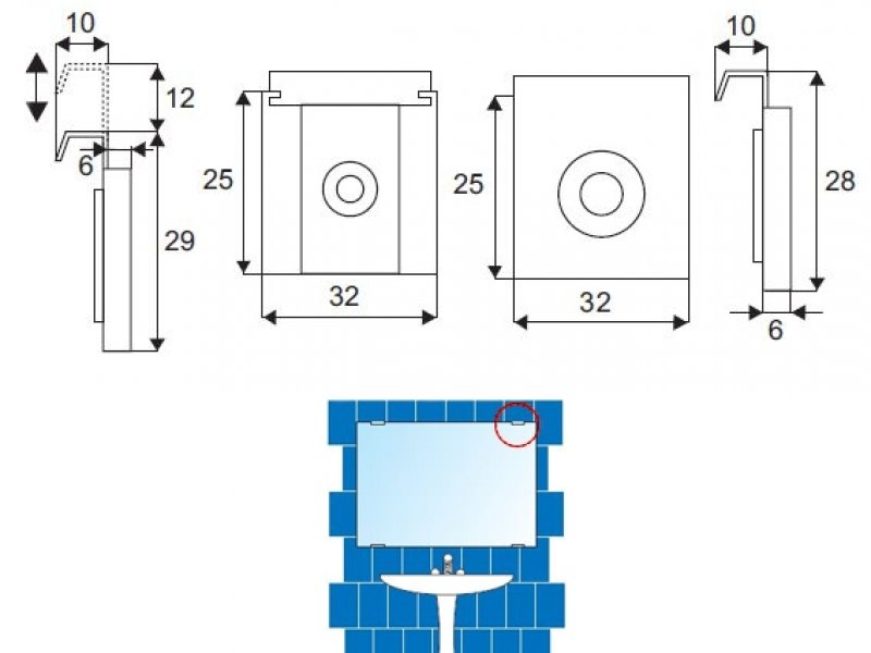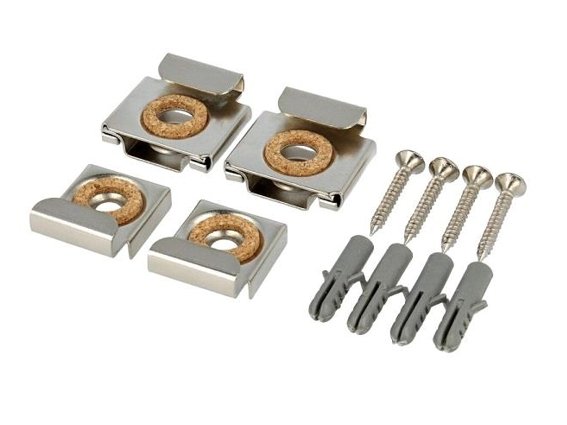 Zrcadlový klip s pružinou Sada zrcadlových klipů s pružinou slouží k uchycení zrcadel za pomoci dvou spodních pevných úchytů a dvou horních klipů s pružinou. Využítí tloušťka zrcadla 5-6mm Obsah balení 2ks spodní klip, 2ks horní klip s pružinou, 4ks hmoždinka, 4ks vrut